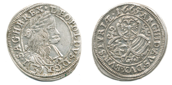 3 kr. 1665 SH, Štýrsko-Graz var.: nad hlavou křížek, opis: G.R () I.S.... / ARCHID.AVS.DVX.BVR.STYRIAE.