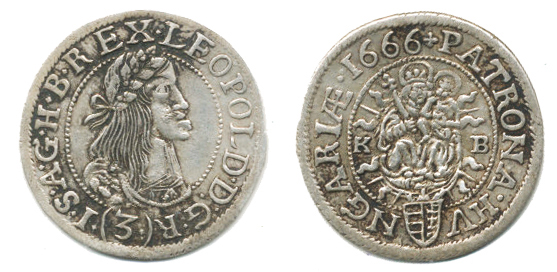 3 kr. 1666 KB jako Hus. 1465, tečka za čísl. "3 ." v nominále _zbytky patiny