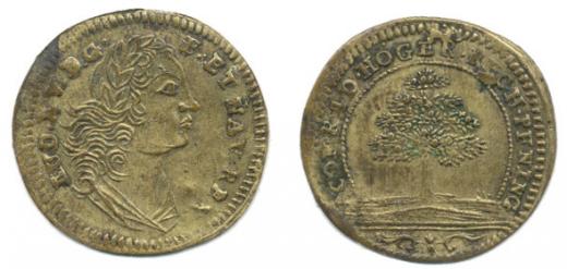 Početní žeton b.l. - Johann Konrad Höger, poprsí francouz. krále Ludvíka XV. zprava / strom s ovocem, opis CONRAD.HOGER.RECH.PF NING mosaz 23 mm