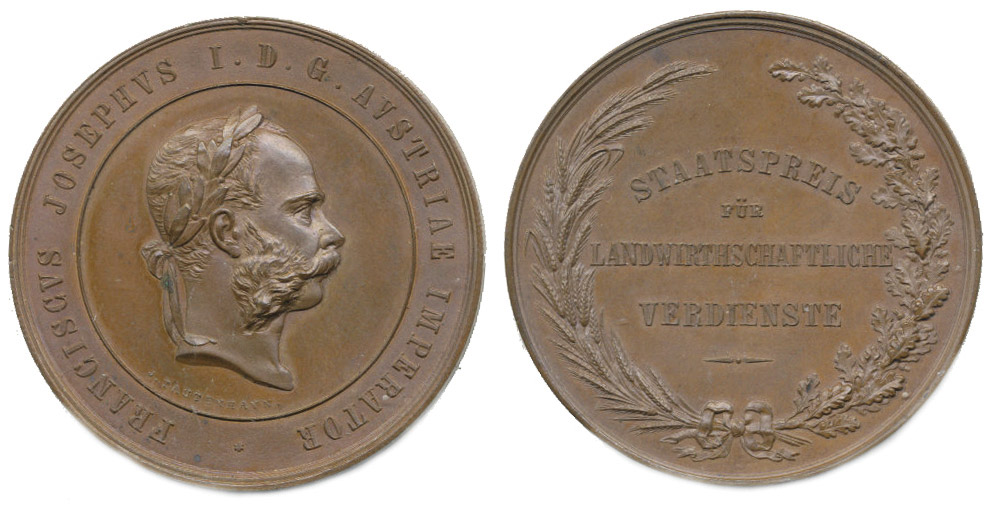 F.J.I., hlava zprava / Státní cena za zemědělské zásluhy (tiskací písmo) německý opis sign.: Tautenhayn Cu 40 mm