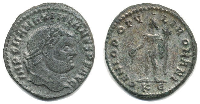 Follis AE 25, stoj.Genius drží obětní misku a roh hojnosti GENIO POPVLI ROMANI KE (Cyzicus) RIC 12b.E