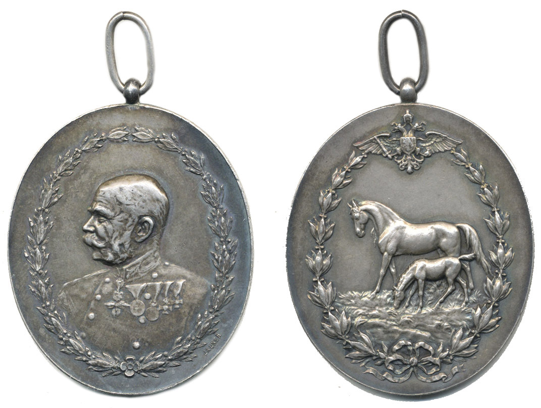 Státní cena za chov koní, poprsí F.J.I. ve věnci v uniformě, bez opisu / klisna s hříbětem ve věnci, bez opisu sign.: JAUNER Ag ovál 42x50 mm orig.ouško +závěs_bez stuhy