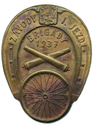 "Závody I. jezd. brigády 1937", uprostřed zkřížené houfnice, naho ře státní znak, vespod vypletené kolo sign.: Pichl masívní bronz tvaru podkovy 30x40 mm "R"_oprav. jehlice