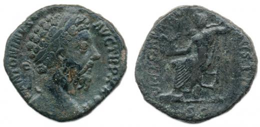 Sestercius, sedící Jupiter na trůnu zleva drží sošku Viktorie VICTORIA AVGVSTI, dole S C; av: hlava zprava M ANTONINVS AVG TRP XXVII jako RIC 1063, ale jiný opis