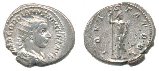 Antoninián, stoj.nahý Jupiter drží v pravé ruce kopí a v levé blesk, bez vojáka IOVI STATORI Sear 8615; Kank.7 var., RIC 84