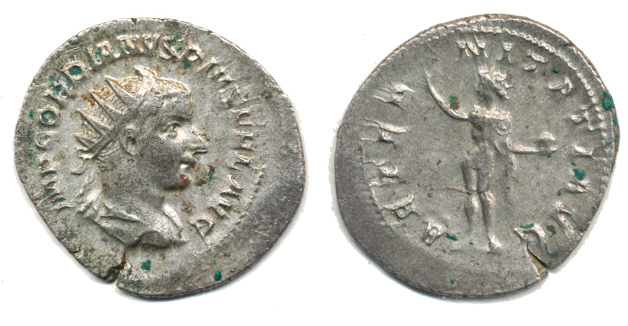Antoninián, stoj.Sol se zvednutou pravou rukou, v levé drží globu s AETERNITATI AVG RIC 83; Sear 8603