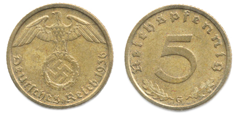 5 Rpf. 1936 G - svastika KM 91 "R"_tém.