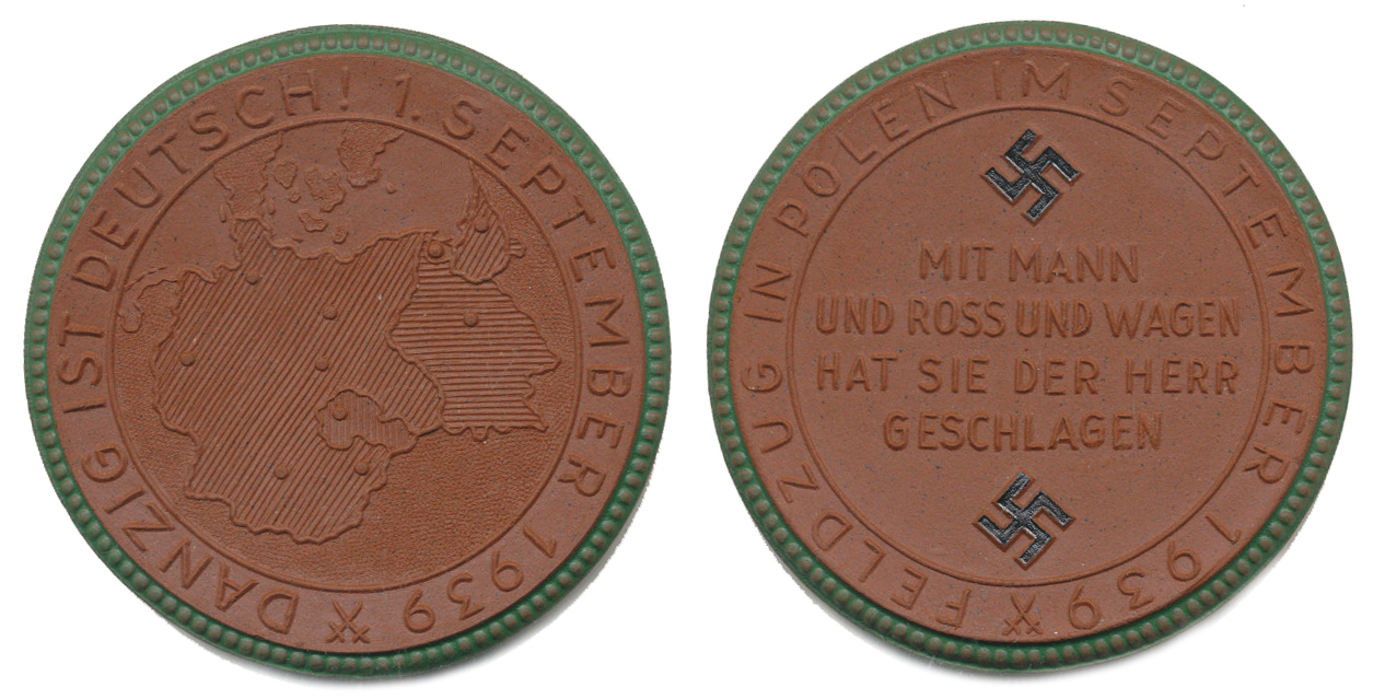 Tažení do Polska v září 1939, Pod a nad svastikou 4-řádk. nápis, opis / mapa a opis: DANZIG IST DEUTSCH ! 1. SEPTEMBER 1939 míšeň. hnědý porcelán se zeleným obvodem a čern. svastikou 50 mm kat. č. 1866i