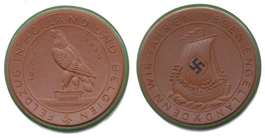 Obsazení Holandska a Belgie 10.5. 1940, Sedící orel a opis / Viki ngská loď se svastikou na plachtě, opis: DENN WIR FAHREN GEGEN ENGELLAND hnědý porcelán 50,7 mm se zeleným krajem kat. č. 1870 V