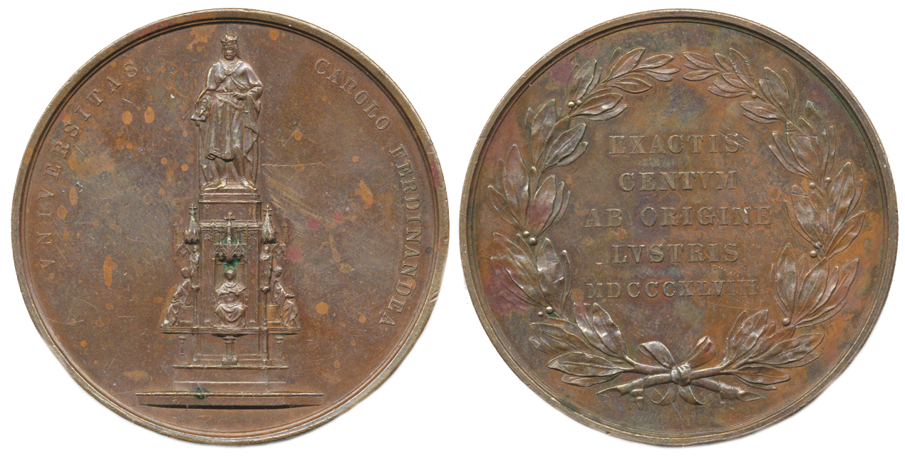 500. výročí založení Karlovy univerzity v Praze 1848, 5-ti řádkov ý nápis / Novogotický pomník Karla IV. bez signatury ! br onz 52 mm NL; Taul 1954