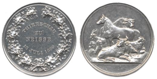 Neisse (Nisa) - Zemědělská výstava, opis v otevř. věnci: THIERSCH AU ZU NEISSE 10 JULI 1889 / zeměsělská zvířata, bez textu Ag 39 mm 18,338 g