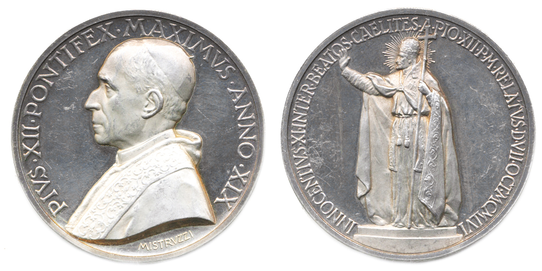 Pius XII., poprsí zleva, XIX. rok pontifikátu (1956) / Beatifikac e papeže Inocence XI., účastníka záchrany před tureckou invazí sign.: MISTRUZZI Ag 44 mm 35,583 g