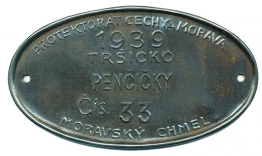 Tršicko - Penčičky 1939, moravský chmel čís. 33 - Protektorát Čec hy a Morava plech.ovál 138x78 mm 2x dírka pro úchyt