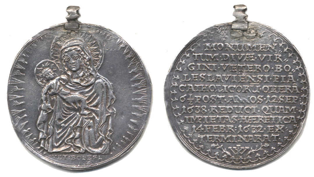 1/2 tolarová medaile 1638 na paměť navrácení uloupeného Palladia země České z Lipska zpět do Staré Boleslavi. sign.: Salomon Scu ltet, řezač želez v pražské mincovně (1636-56) Ag 42,5 mm 16,41 g nalet. ouško Přibil uvádí pouze tolarovou ražbu (č. 210); Donebauer 4087_m.š.