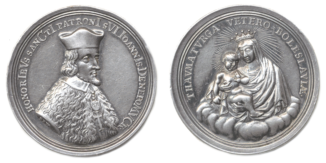 Tolarová medaile na beatifikaci Jana Nepomuckého, A: Poprsí sv. Jana zprava, na prsou medaile a kříž. Opis s chrono gramem 1721 / R: Panna Maria Staroboleslavská na oblaku s perlovou korunou a paprskovou svatozáří Ag 45,5 mm 29,887 g Přibil 260