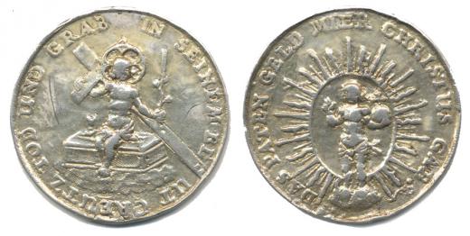 Johann Kittel ? - Sedící Kristus s křížem na náhrobním kameni / S tojící Kristus s královským jablkem, kolem něj gloriola s paprsky a plamínky Ag litá 35 mm 13,17 g