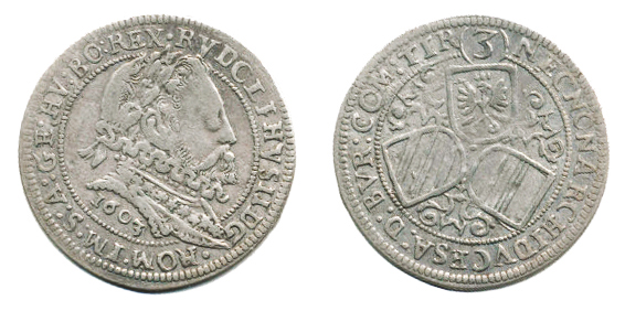 3 kr. 1603, Tyroly Hall jako MA tab. 11/ č. 25 ale vídeňský er b bez ozdob (jako typ 26), chybný opis - C a F ve jménu RVDCLFHUS II DG .ROM. IM:S:A:GE:HV:BO:REX. / NECNONA.ARCHIDVCESA:D:BVR:COM:TIR(3) "R"