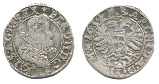 3 kr. 1634, Kutná Hora-Prunz MKČ 810 var.opisu: FERD.II D.G.R (zn) I.S.A.G.H.B.REX */ A.D () BV.M.M.1634 velká kladívka v minc. zn._mělčí ražba