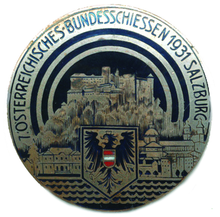 Smaltovaný odznak: I. Österreichisches Bundesschiessen 1931 Salzb urg, panoráma města s hradem a ve štítu orlice 35 mm zapín. spona
