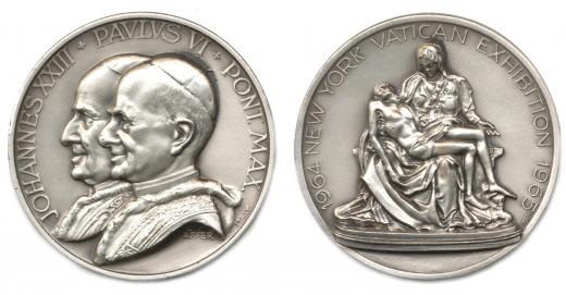 Vatikán - Jan XXIII. a Pavel VI., dvojportrét papežů zleva, opis / Výstava New York - Vatikán 1964-1965, Michelangelova Pieta, opi s bílý kov 50 mm