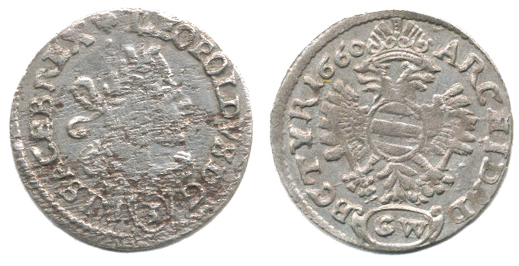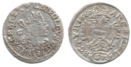 3 kr. 1660 GW, Kladsko-Werner "RR" MKČ 1646 chyboražba (míst o G H B REX raženo C H B REX ) +starý podlož. štítek fy. Ludwig Herinek Wien_vada stř. v av.