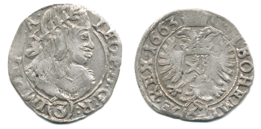 3 kr. 1663, K.Hora-Hackl jako MKČ 1451, opis: LEOP.D.G: R: _mír. exc. stř., v ploše rv. RL, mělčí ražba