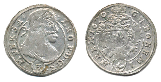 3 kr. 1670, Kutná Hora-Hackl jako MKČ 1452, BOHEMI() .AE. REX. , tečka za datací, nápadně malá čísl. "3" v hodnotě _mír. nedor.