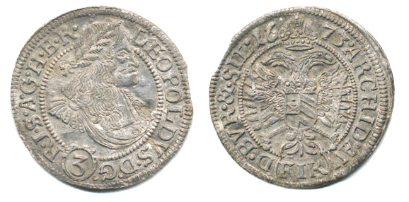 3 kr. 1673 FIK, Opolí-Kirschenhofer jako MKČ 1663, ale v hor ním čtverci štítku tečka, v prostředním křížek, opis: H. B. R. _patina