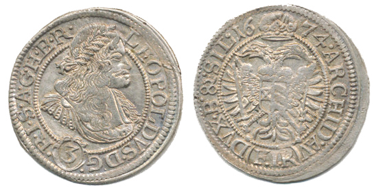 3 kr. 1674 FIK, Opolí-Kirschenhofer jako MKČ 1664, ale bez stuh "R"