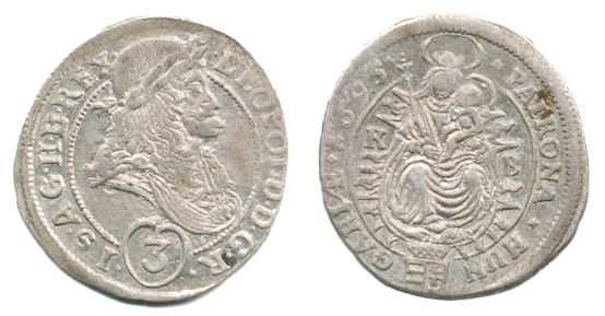 3 kr. 1695 KB Husz. -, malé poprsí a markantně velká "3", opis: .LEOPOLD.D.G.R.() .I.S.A...... / .PATRONA. HUN - GARIAE. (písmeno "U" v HUN)_mělčí ražba, tém.