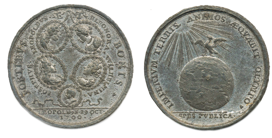 Medaile 1700, na narození syna Leopolda Josefa, Pět rodinných med ailonů / ozářená zeměkoule s orlem Sn 37 mm