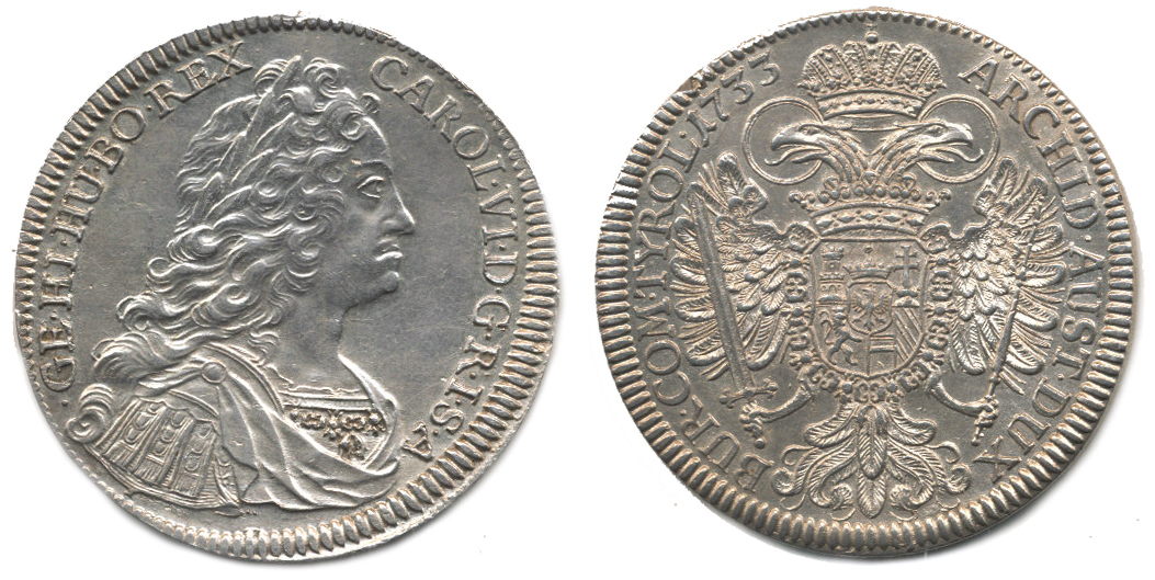 Tolar 1733 b.zn., Tyroly Hall - var.: pod poprsím dvě tečky "sbírkový stav" 28,56 g