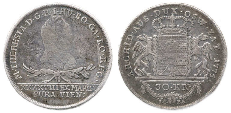 30 kr. 1775 IC-FA, Vídeň pro Halič "R"_mělce raž. portrét