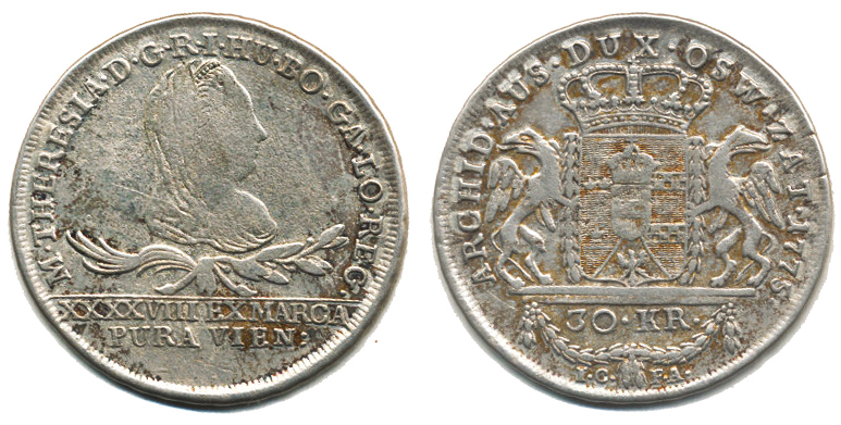 30 kr. 1775 IC-FA, Vídeň pro Halič "R" _mělce raž. portrét, nep. hr. ražbou