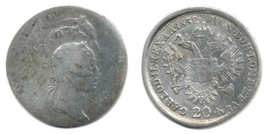 20 kr. 1832 - zmetek z mincovny !! v Av. čtyřikrát přes sebe vyr ažená hlava panovníka / Rv: orlice, mírně excentr. ražba, proti A v. nepatrný dvojráz "RR" (zřejmě ražba mincovny Kremnica)