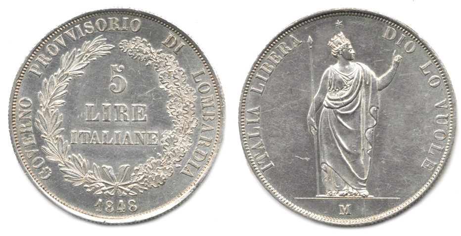 5 Lire 1848 M - krátké konce ratolestí věnce nad letopočtem No v. 39a_zc. nep. rys.