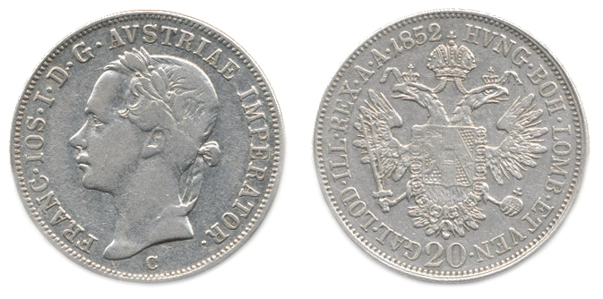 20 kr. 1852 C - hlava doleva "RR"