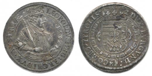 Tolar 1632, Tyroly Hall Voglhub. 183/IV opis: LEOPOLDVS. D:G:ARCHIDVX.AVSTRIAE. / DVX.BVRGVND: COMES.TYROLIS. _patina