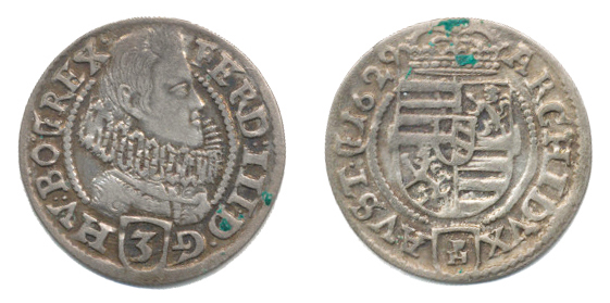 3 kr. 1629 PH, Kladsko-Hema MKČ 1335 zn. č. 2, nominál ve čtv erci, jiné poprsí MKČ tento typ neuvádí "R"_patina