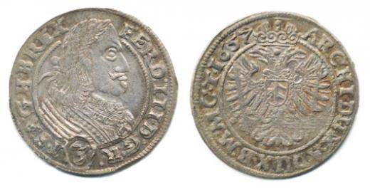 3 kr. 1657 GH, Vratislav-Hübner jako MKČ 1294, ale v rv. kruh perlovcem, pod korunou jablko s křížkem!! "R"_nezn. just.