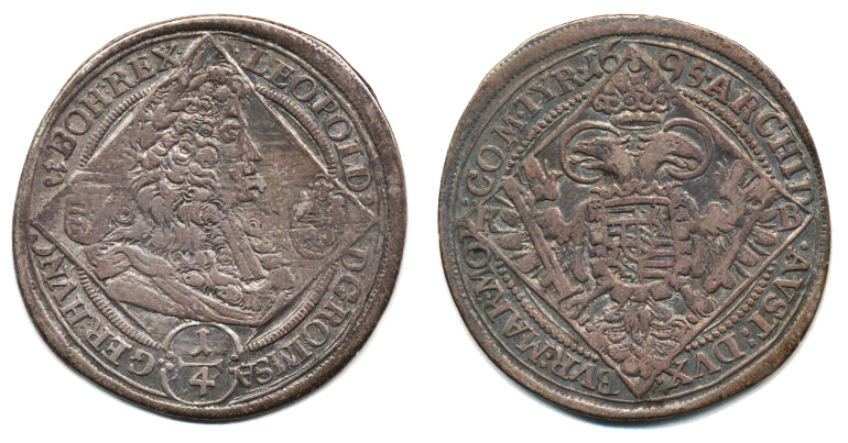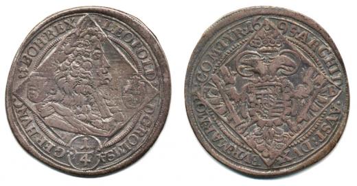 1/4 Tolar 1695 KB jako Husz. 1410, ale v Rv. perličkový kruh, jiný typ koruny, opis: .ARCHID - .AVST: DVX. - BVR: MAR. MO - :CO M. TYR. "R"_mělčí ražba