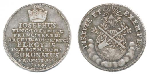 Malý žeton ke korunovaci na římského krále 3.4. 1764 ve Frankfur tu, Koruna, 9-řádkový nápis / Zeměkoule v oblacích, Boží oko, opi s Ag 21 mm Nov.XV/C/14b