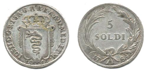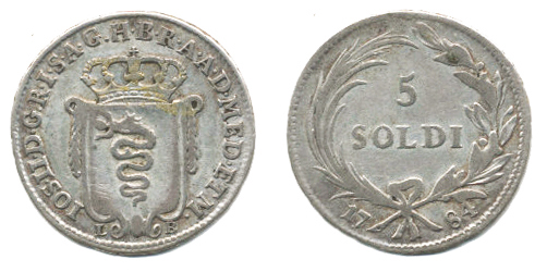 5 Soldi 1784 L-B, pro Lombardsko "R"_tém.