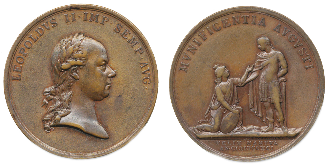 Medaile 1791 - k holdování v Mantově 1791, hlava zprava a opis / před stojícím císařem vpravo klečící patronka Manntovy se štítem, opis sign.: J.Vinazer Cu 44 mm Mont. 2250; Nov. N1b