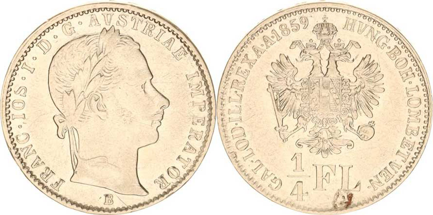 František Josef I.(1848-1918), 1/4 Zlatník 1859 B, v rv. vada mat., tém.