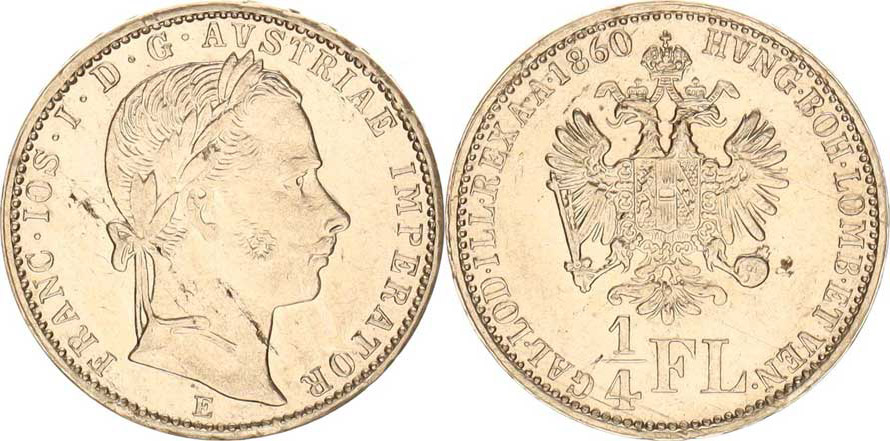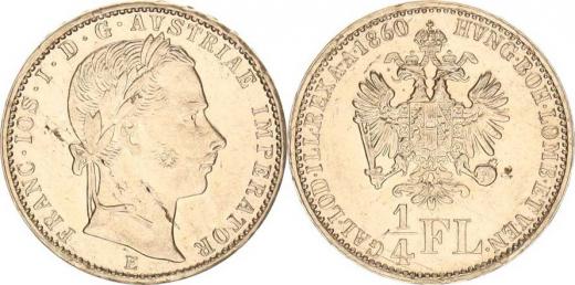 František Josef I.(1848-1918), 1/4 Zlatník 1860 E "R", dr. rys., tém.