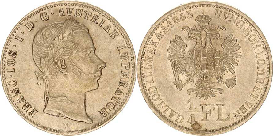 František Josef I.(1848-1918), 1/4 Zlatník 1863 V "RR" 5,345 g, vada stř. u hr.