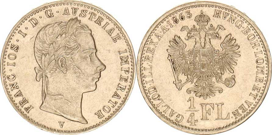 František Josef I.(1848-1918), 1/4 Zlatník 1863 V "RR"