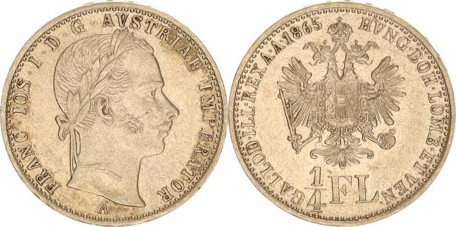 František Josef I.(1848-1918), 1/4 Zlatník 1865 A "RR" 5,338 g