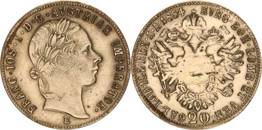 František Josef I.(1848-1918), 20 kr. 1854 E "R", just. rv.